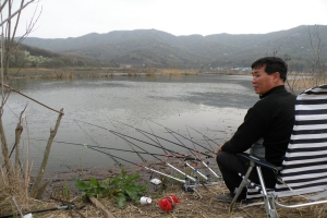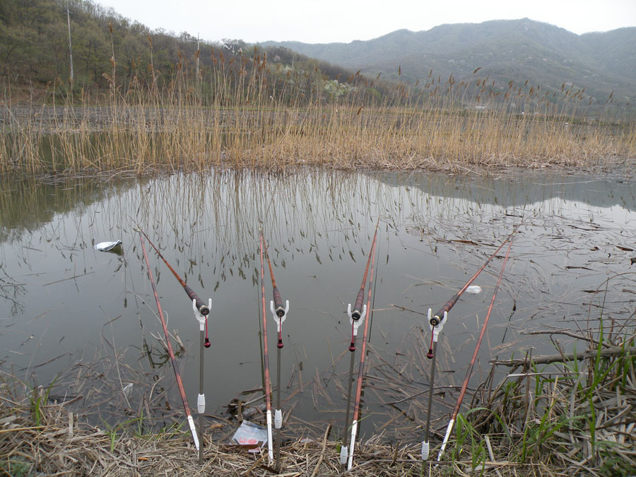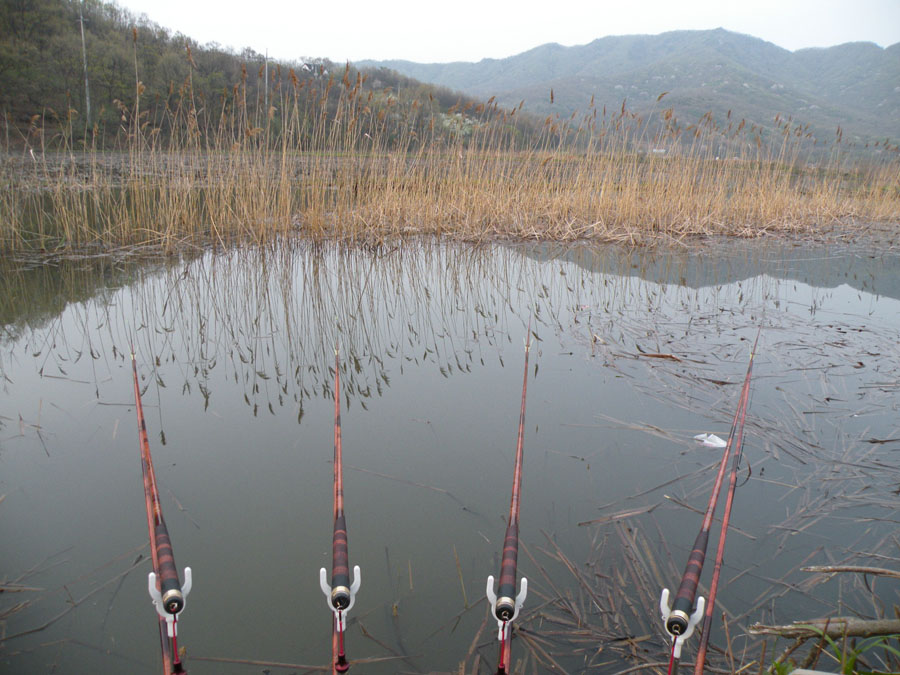 | 바람을 피해 갈대를 바람막이 삼아 채비했습니다. |
