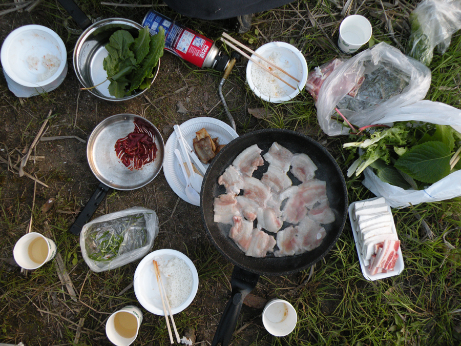 필자가 준비한 삼겹살로 저녁을 먹으며 소주도 한 잔 합니다. |