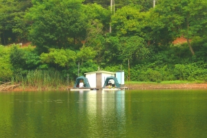 상류 우측편 포인트에 위치한 수상좌대 전경 |