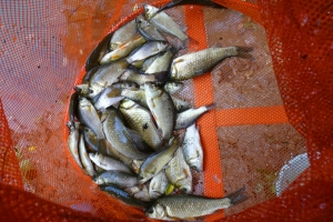 | 밤에 넣어 놓았던 새우망에 가재와 새우가 가득합니다. |