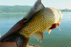 해 질 무렵에 첫 입질을 받고 황금붕어를 걸어 내었습니다. |