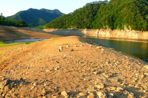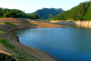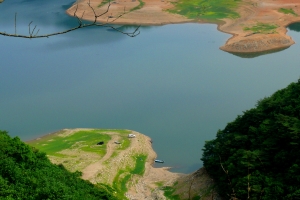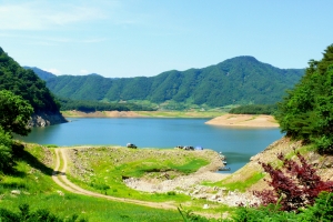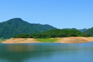 다래골 산장을 가기 위해서 산 정상에서 찍은 파로호 전경 |