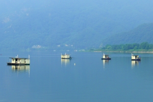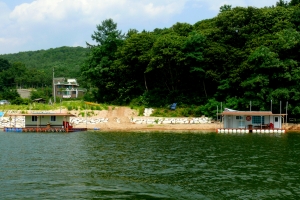 | 삼천낚시터 관리소와 산쪽에 배치된 수상좌대 전경 |