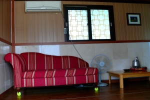 | 거실에는 에어콘, 쇼파, TV를 시청할 수 있습니다. |