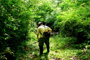 | 다래골 사장님이 민박 손님들의 야영을 위해서 계곡 정리를 하고 있는 모습 |