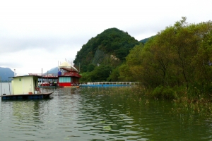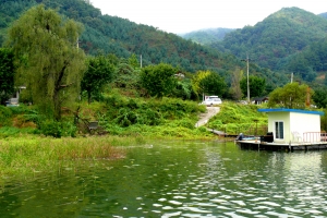 | 가을철 수위에 맞추어서 수초대로 좌대가 편성된 의암댐 거북이낚시터 전경 |