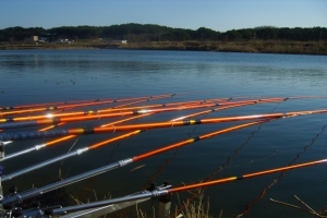 괜챦다 싶은 곳에 대를 널어 보았습니다... 수심은 멀면 멀수록 깊었습니다. |