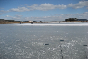 서둘러 얼음구멍을 뚫고... 따뜻한 햇볕이 비추기 시작합니다. |