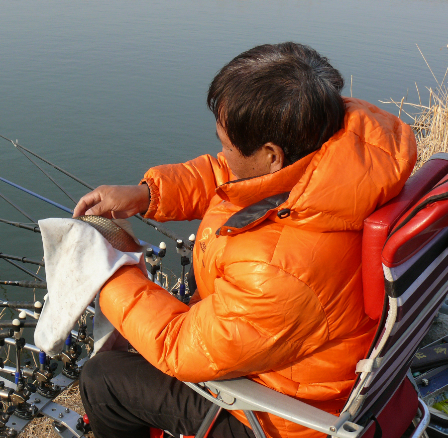 | 붕어를 잘 감싸고 바늘을 제거 하고 있습니다 |