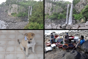 정방 폭포입니다 | 민물이 바다로 바로 떨어지는 폭포라는군요 정방폭포 지킴이인데 이름이 뭐게요?? (경비 간부 후보생) ㅋㅋㅋ | 바닷가에서 파는 해산물인데 이제는 자연산이 없다고 합니다 |