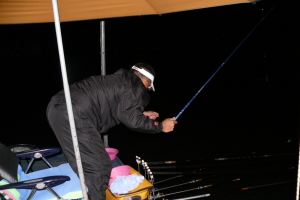 윤교수님이 약한 입질을 보고 챔질에 성공을 했습니다. |