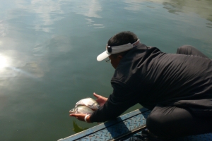 오후시간에 윤교수님이 붕어를 걸어 내고 있습니다. |