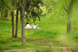 그늘에서 사랑에 미로를 속삭이는 연인도 있어요. |