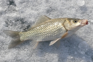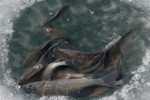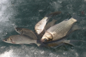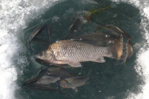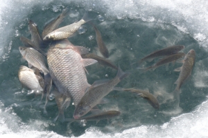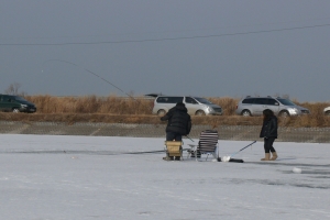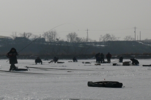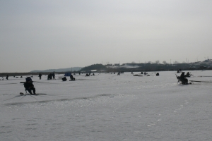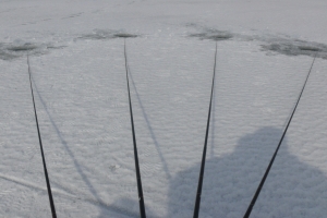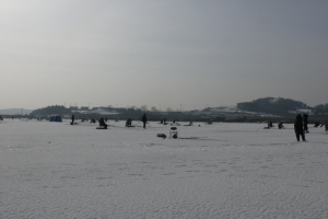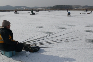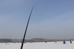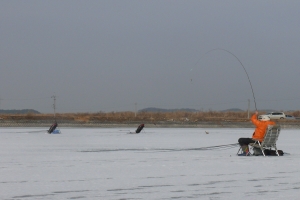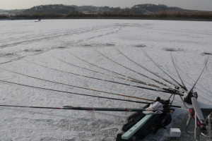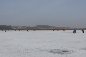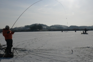 | 중앙부근에서 낚시를 한 조사의 얼음살림망 월척급이 있습니다. |