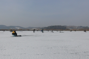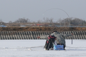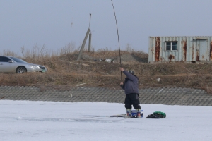 중앙부근에서 낚시를 한 조사의 얼음살림망 월척급이 있습니다. |