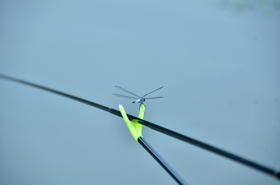 필자의 낚싯대 위에 잠자리가 앉았어요. |