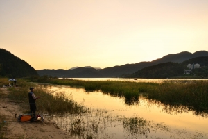 청평땜 본류권 샛수로에 노을이 물들어갑니다. |