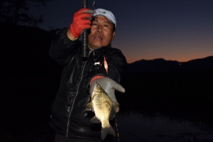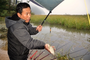 | 보트에서 조사님이 36cm급 붕어를 낚아냅니다. |
