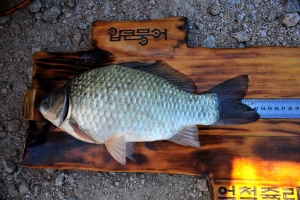 | 계측자에 올려 보니 33.6cm 정도가 나오네요~^^; 짝짝짝!~ 참고로 필자는 1미터 아래에서 나온 붕어는 3치는 뺍니다^^;;ㅋ |