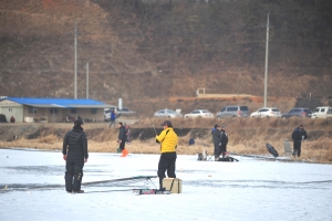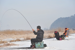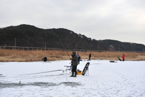 | 투덜투덜대며 얼음낚시 처음으로 10대까지 널어 봅니다. 하지만 블루길만 덤빕니다.ㅠㅠ |