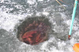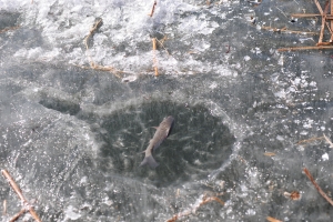 | 세마리의 붕어가 얼음집안에 있네요~ 피를 좀 흘린듯!~ㅠ |