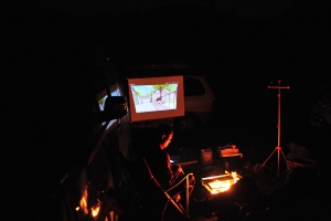 | 장작불을 피우고 민서를 위해 빔프로젝트로 만화영화도 틀어 줍니다.^^ 월드컵 보려고 장만했지요^^ㅋ |