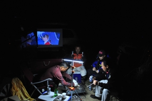 장작불을 피우고 민서를 위해 빔프로젝트로 만화영화도 틀어 줍니다.^^ 월드컵 보려고 장만했지요^^ㅋ |