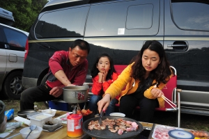| 물이 너무 맑아 낮낚시는 포기하고 일찍 저녁을 먹기로 하고 간만에 먹는 쥴리님의 된장찌개와 고기와 이슬로 저녁을 먹습니다. |