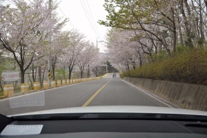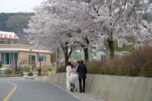| 신도에는 아직 벚꽃이 만개해있는데 아름다운 커플이 하이킹을 합니다. |