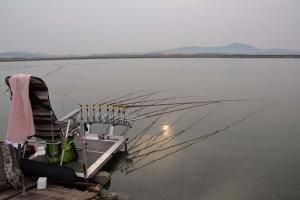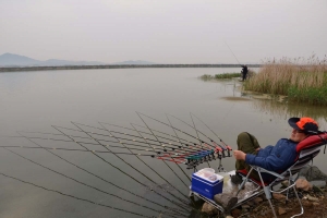 미수조사님이 10대를 채비하고 찌를 응시합니다. |