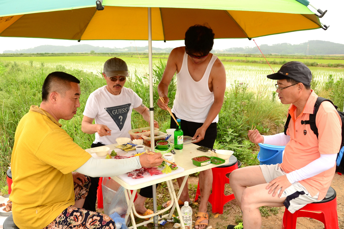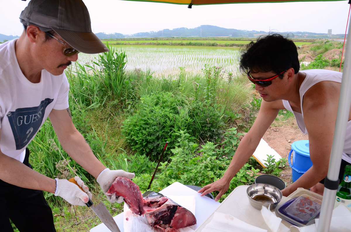| 발전소에 근무하며 자전거 하이킹을 즐기던 분도 함께 참치회를 먹습니다. |