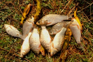 아침에 빈대님이 수초속에서 붕어를 걸어 냅니다 |