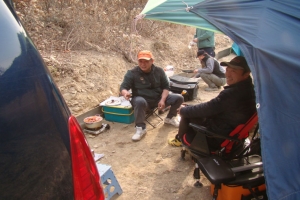 | 늦게 도착하니 친구들이 먼저 와 있습니다 가볍게 쐬주한잔하고 대를 편성합니다. |