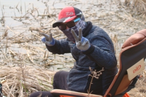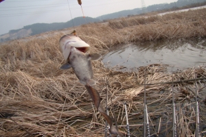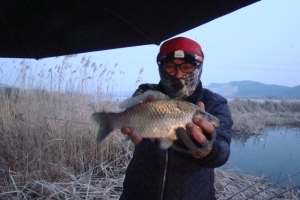 옆 조사님이 부들 작업을 합니다, 옆조사님이 아침에 4짜 덩어리 한 수 올립니다. 부지런한 모습이 덩어리를 준 것 같습니다. 생자리를 노리는 것이. |