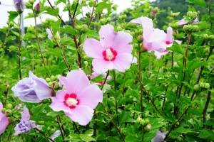 입구에 우리나라꽃인 무궁화가 아름답게 피었내요 |