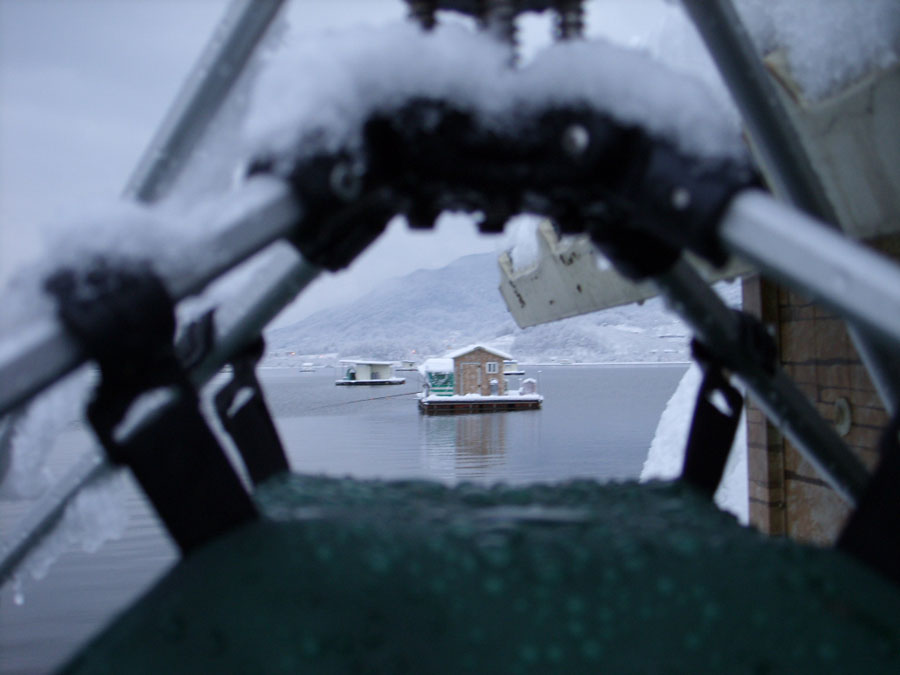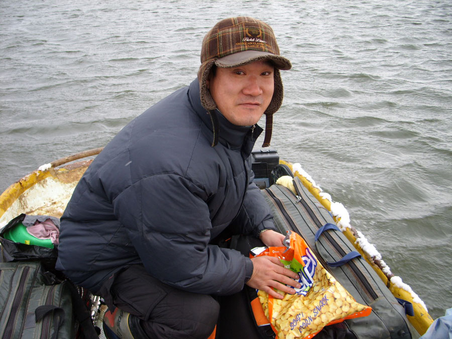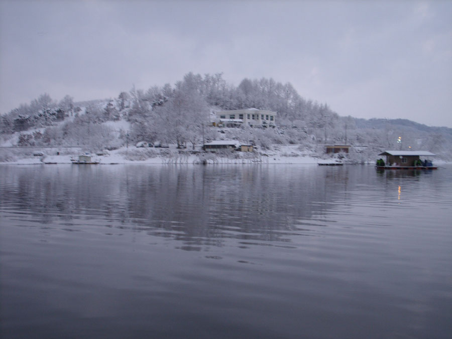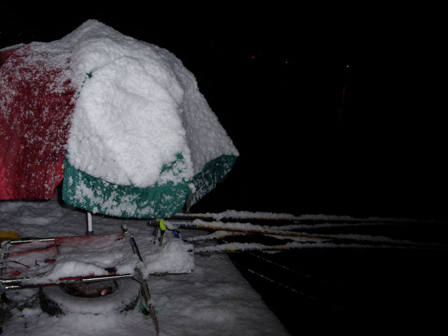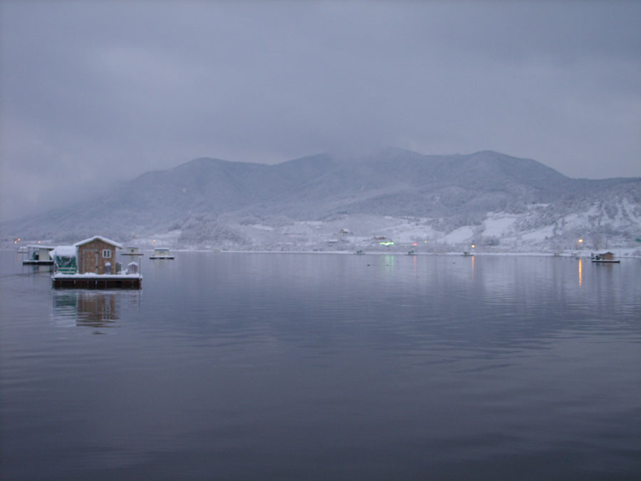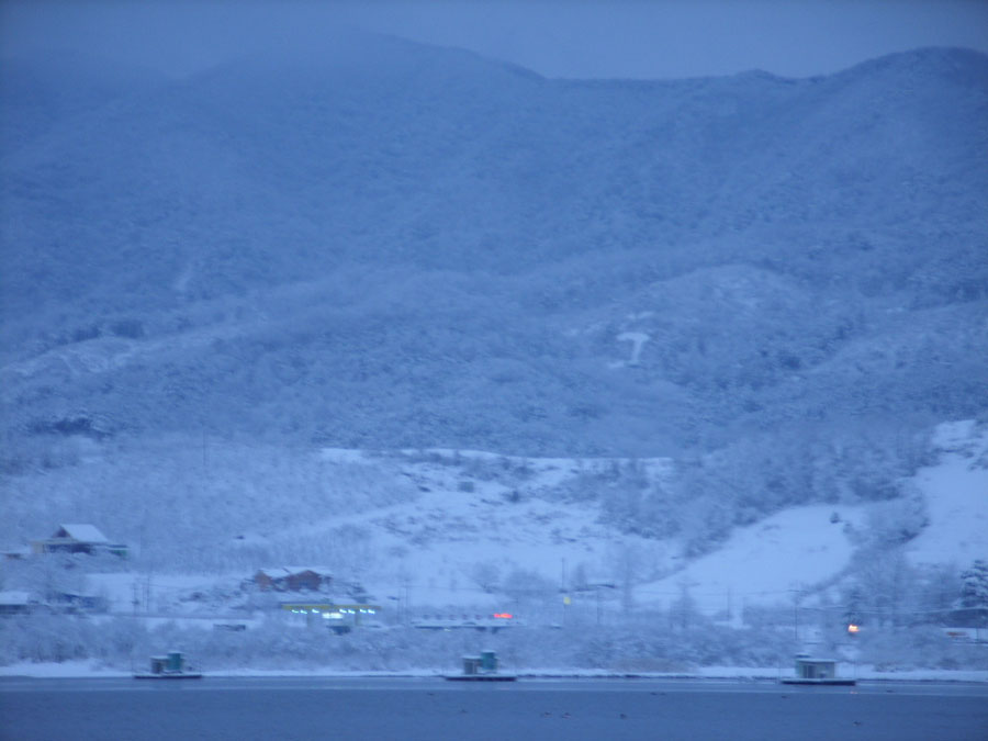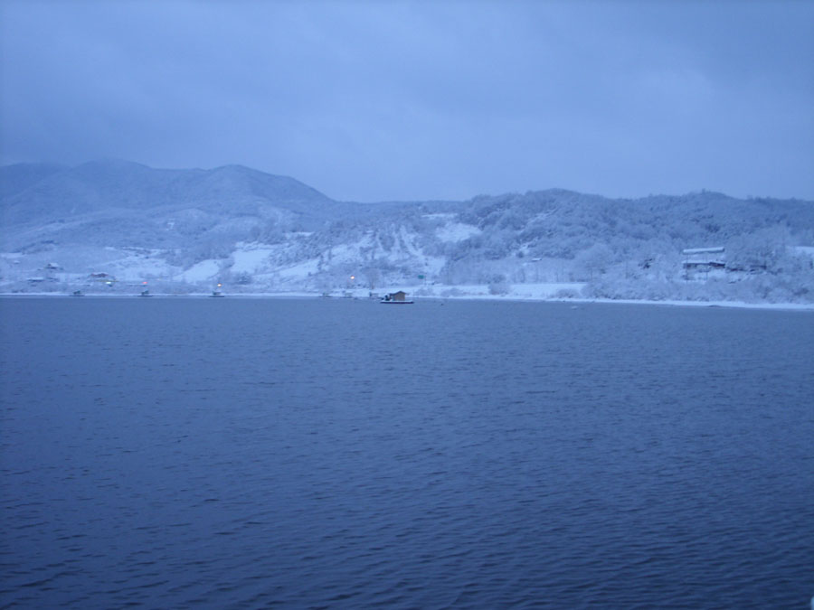 입질도 없고, 별도 밝아 민생고나 덜려고 불판을 중심삼아 둥글게 둘러앉아 삼겹살에 소주를 한잔씩하며 우연히 밖을 바라보니 눈발이 날린다.