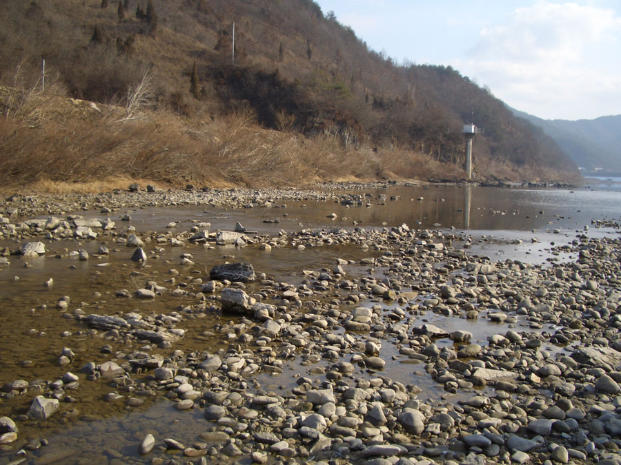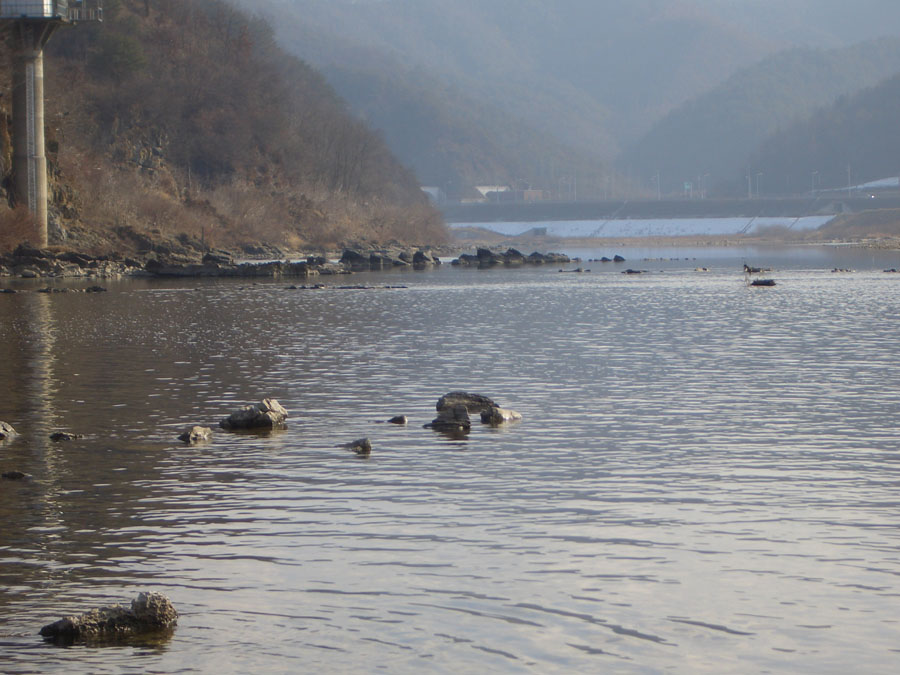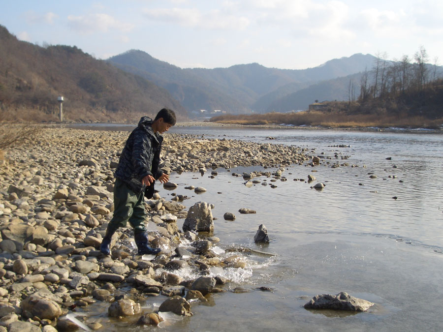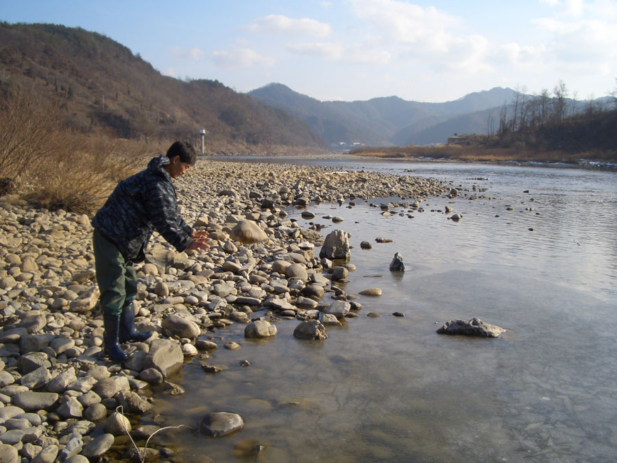 뒷집 선배와 함께 강으로 나오니 물흐름이 적은 곳에서만 살얼음이 조금 얼었을뿐 아직도 돌치기 하기엔 부족함이 보였다.