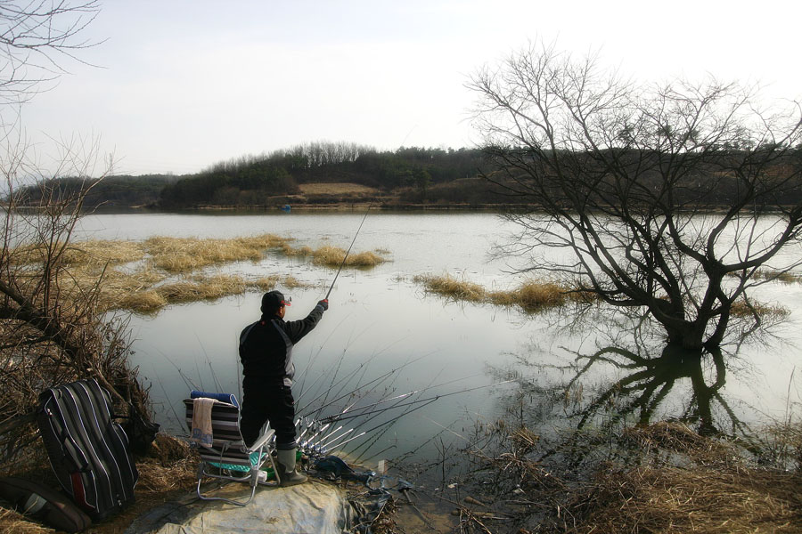진천 덕산지의 봄날. 많은 꾼들로 때이르게 많은 꾼들이 자리를 잡고 있습니다만.