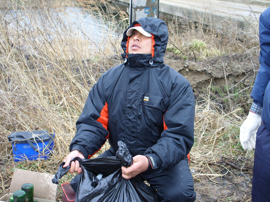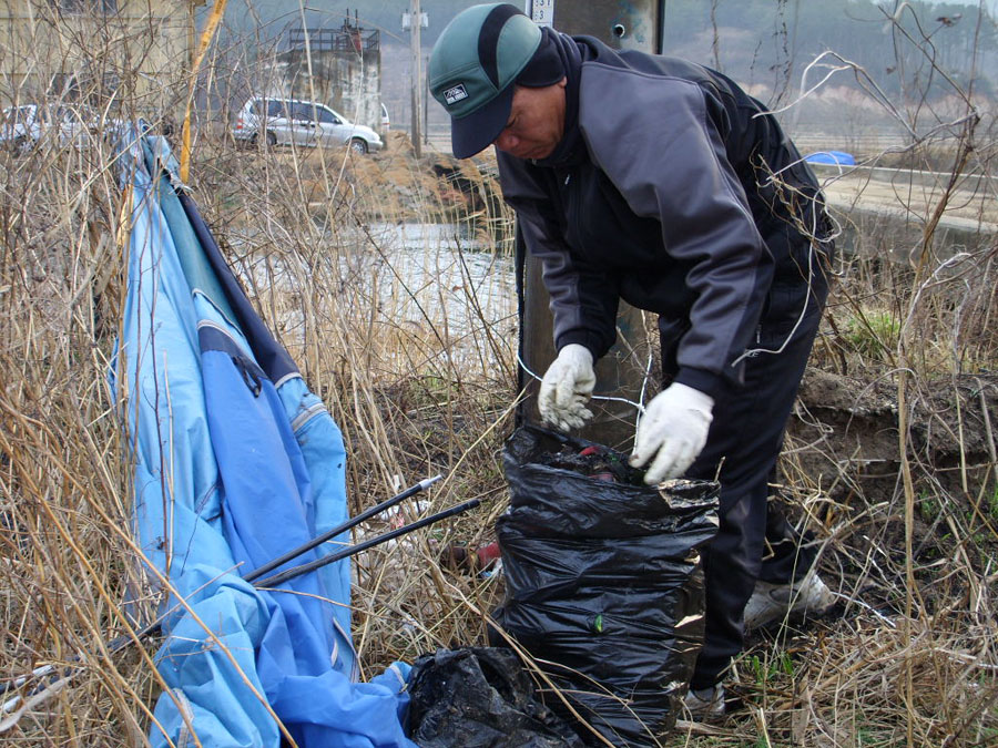 내리는 비를 맞으며 주변 청소를 하고, 입큰붕어와 어수림 파이팅을 외치며 마무리를 한다.