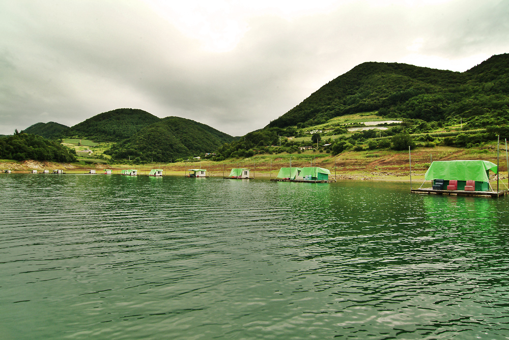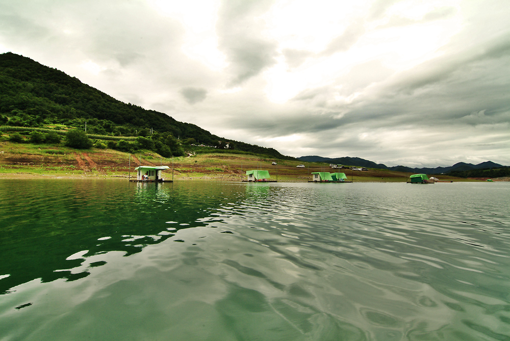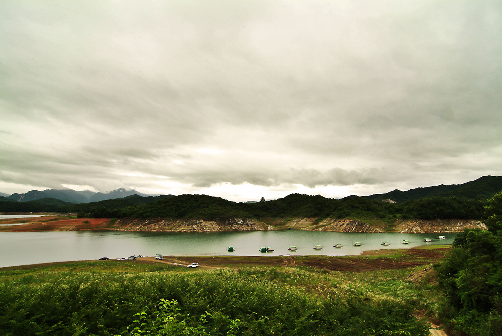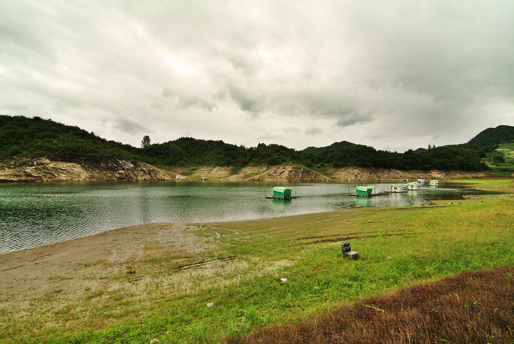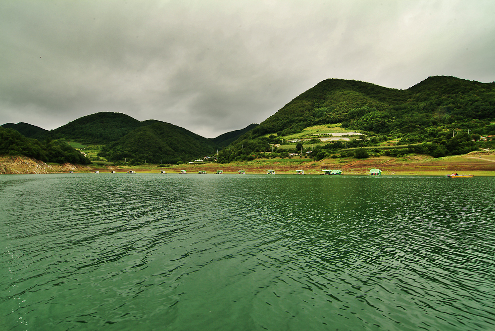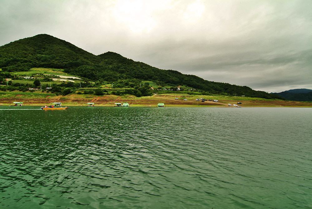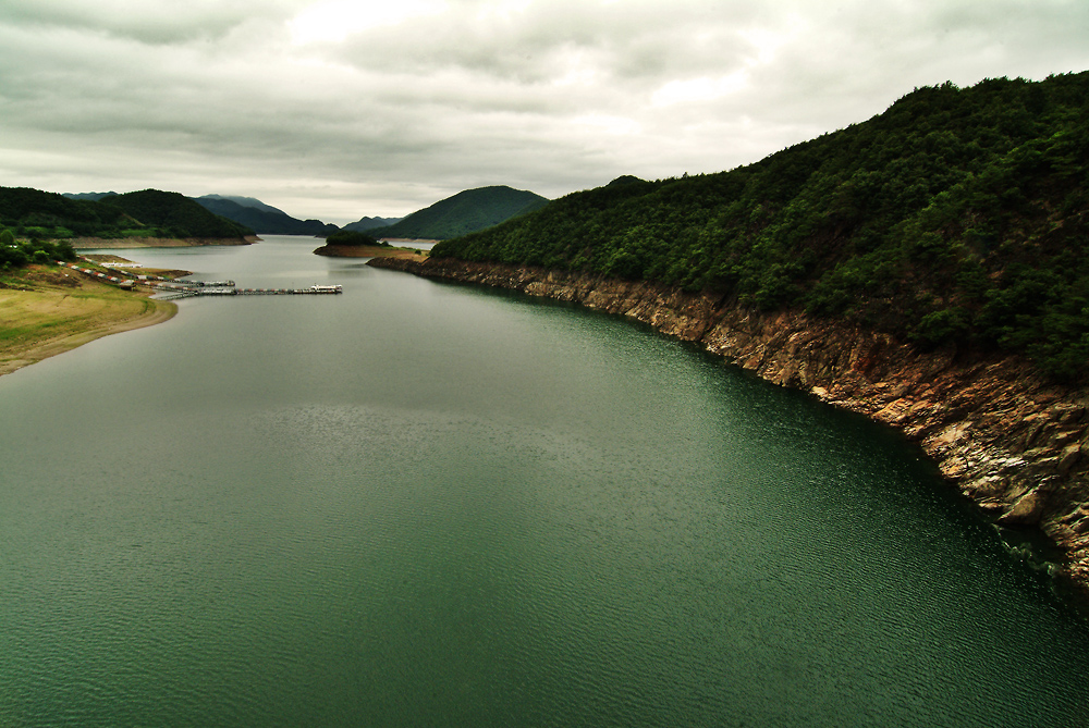깎아진 절벽의 느낌과 댐 특유의 육초밭과 모래톱 풍경 모두가 한번에 담겨 있다.