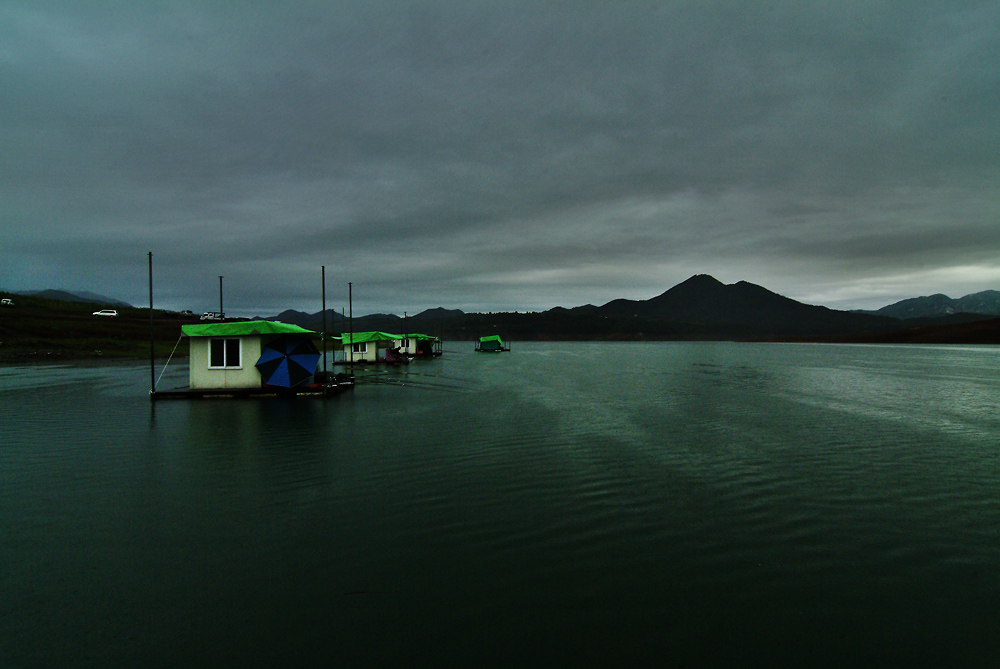좌대들 모습, 조금만 물이 더 차면 좌대들 뒤로 육초들이 잠길 것 같습니다.