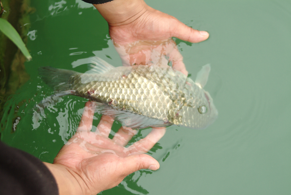 8치급의 예쁜 충주호 붕어가 얼굴을 보여 준다.
