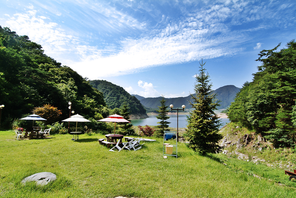 산장의 마당 잔디밭에서 파로호와 함께~