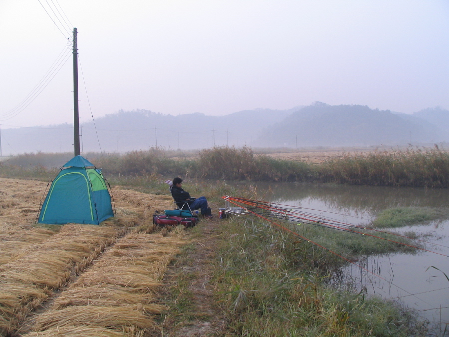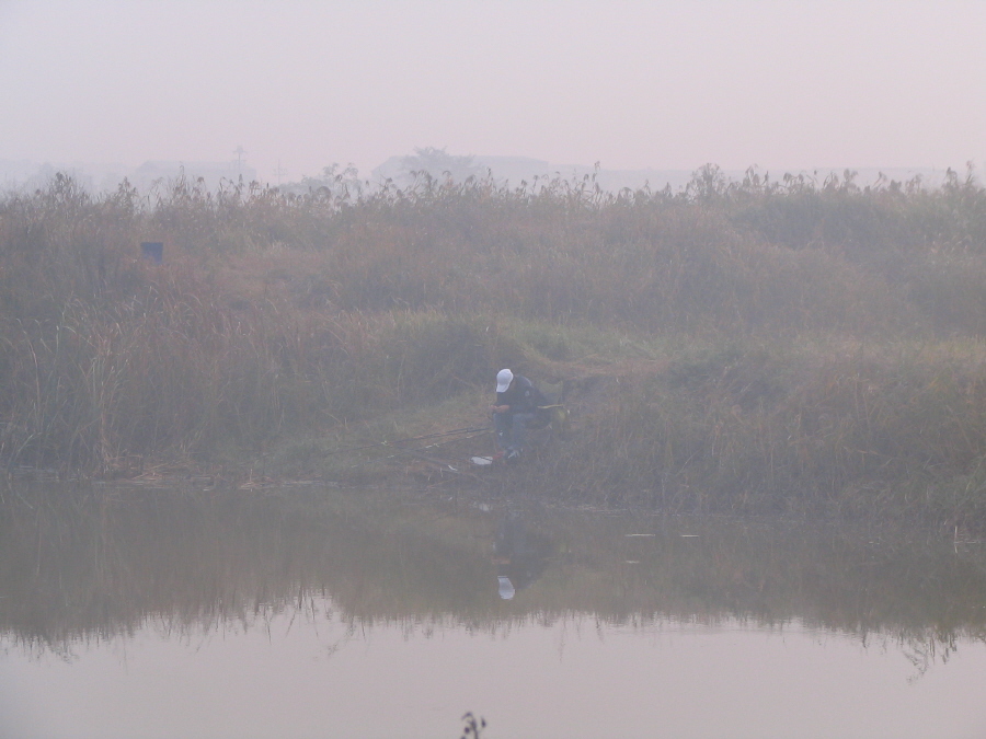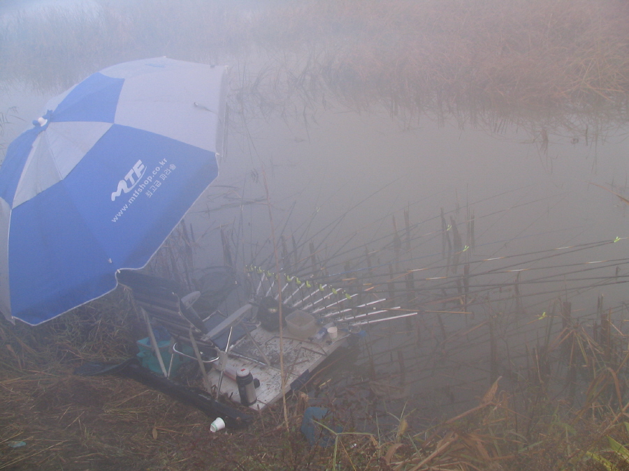 필자의 낚시자리 - 밤새 안개가 오락가락했습니다.