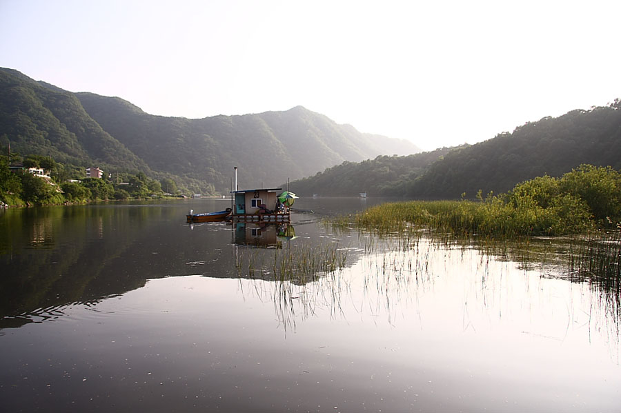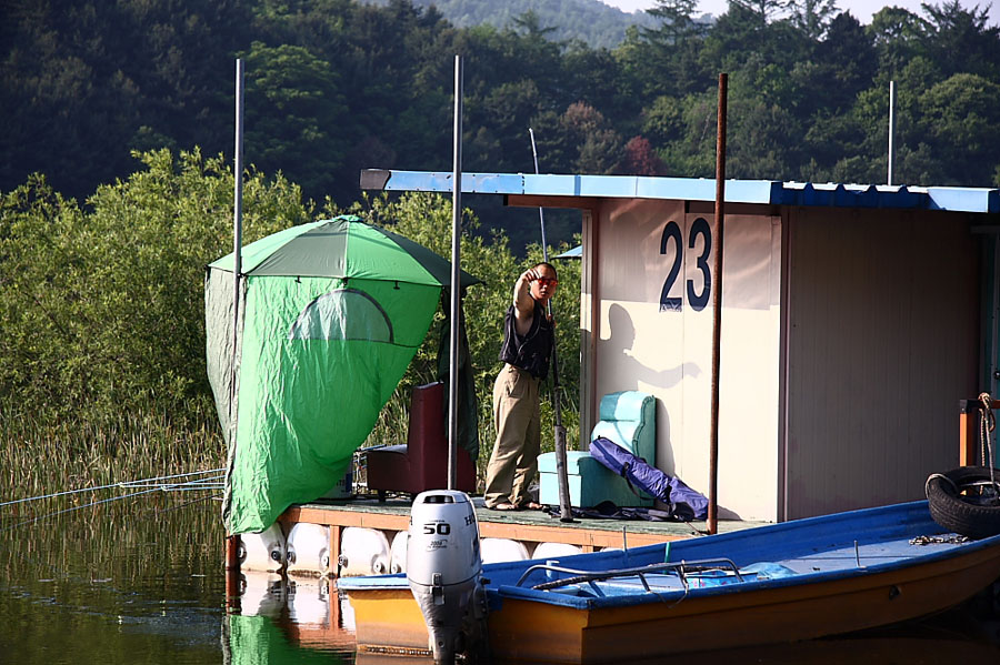 상류냐 하류냐 고민끝에 상류 수초사이 좌대로 정한 후 2개의 좌대로 나뉘어 타고 낚시 준비를 한다.