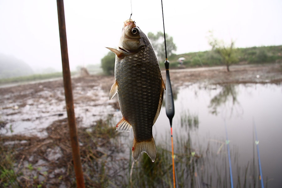 어이가 없어 다시 들어갈까 하다가 혹시나하고 낚싯대를 드리워보는데... 잠시 후 3시경 첫 입질을 받고 떡붕어 40cm급과 상면하게 되었다.