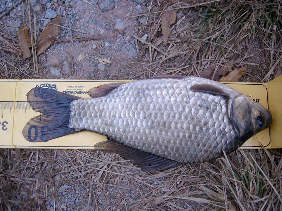 새벽 5시에 3.0칸대의 찌가 서서히 올라와 강한 챔질에 붕어가 무우뽑히듯 뽑혀 올라와 끌어내 보니 32cm급 월척이다~