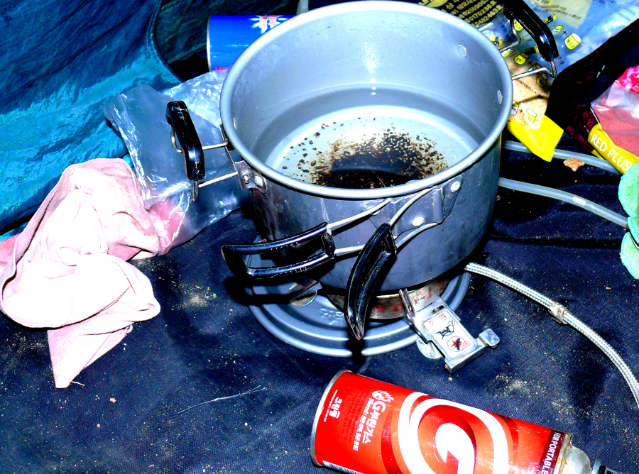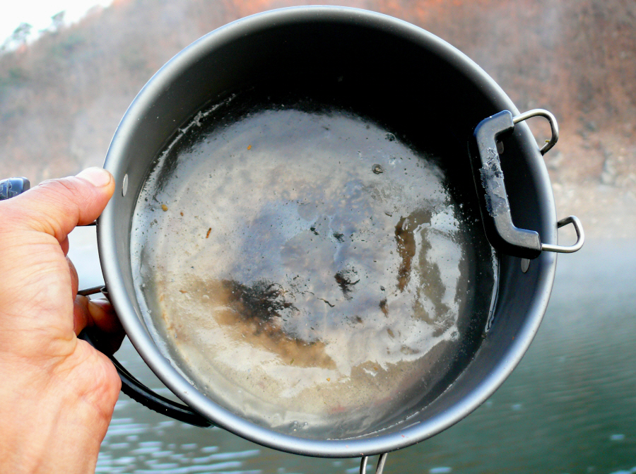 코펠에 떠 논 물이 땡땡 얼었습니다.