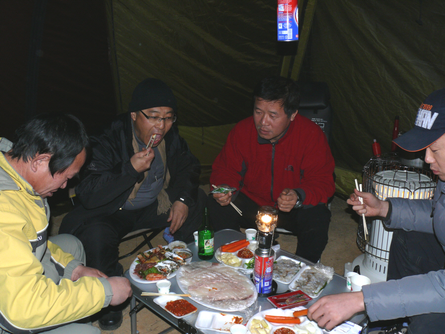 한 겨울 긴밤을 콩밭님의 대형 텐트속에서 임신붕님이 준비해 준 자연산 광어회와 매운탕으로 저녁시간을 즐겁게 보냈다.