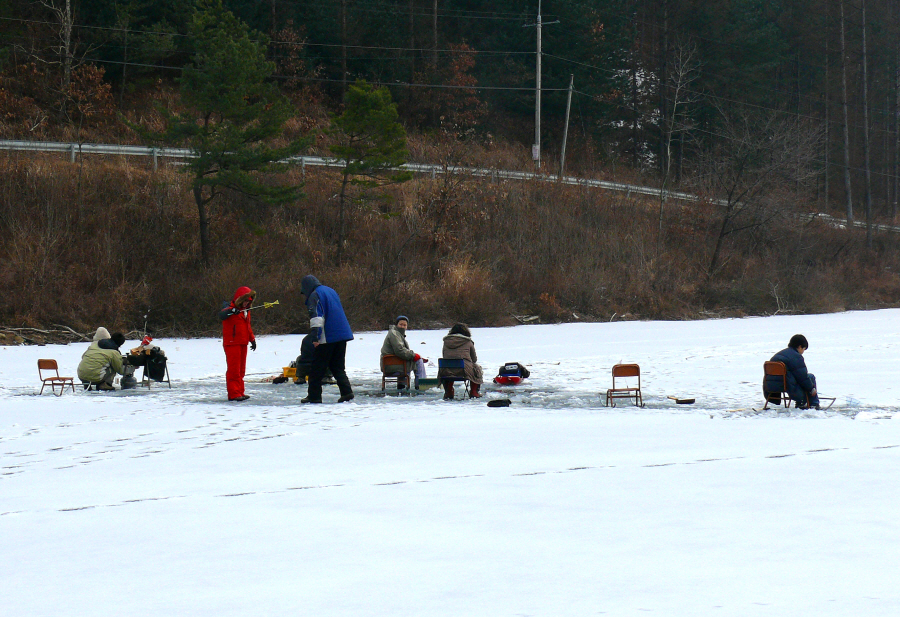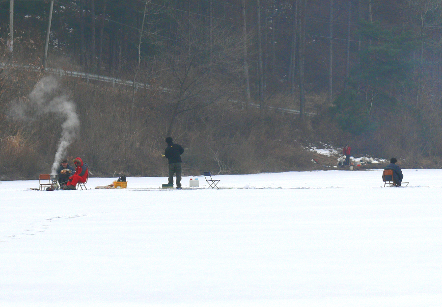 삼삼오오 모여서 빙어낚시를 하고 있는 가족들은 마냥 즐거운 모습이다.